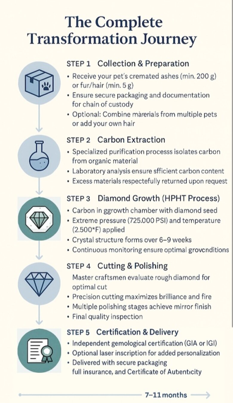 The complete process takes 7-11 months from receiving your pet's ashes to delivering your finished diamond. This includes 2-6 weeks for carbon extraction, 6-9 weeks for diamond growth, and 2-6 weeks for cutting and polishing. Rush service is available to complete the process in 5-6 months for an additional $1,500.
