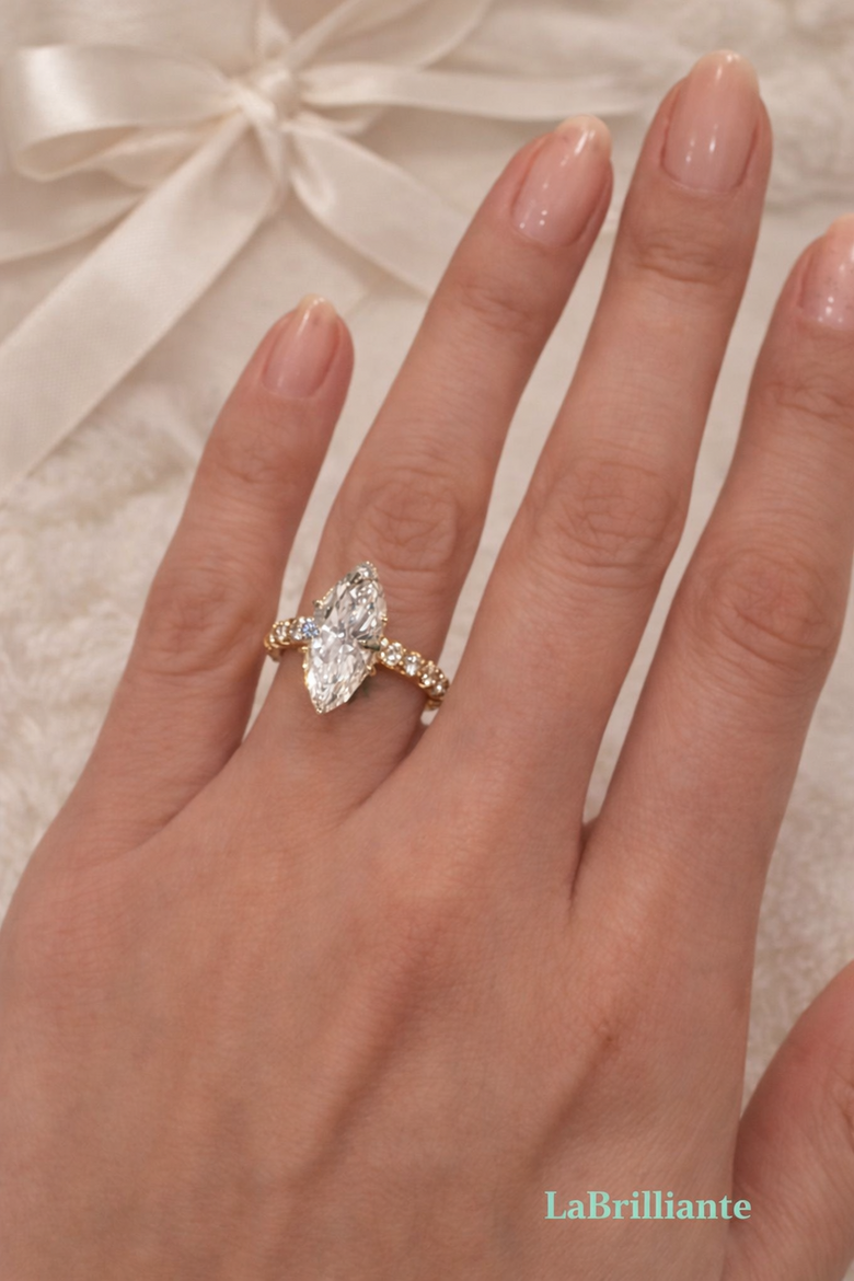 Book a consultation with Labrilliante's design experts before January 31st to ensure Valentine's Day delivery. We'll match Selena's yellow gold pavé aesthetic to your budget, timeline, and vision—because forever begins now, and your marquise moment shouldn't wait. Contact us today to transform royal romance into your reality.